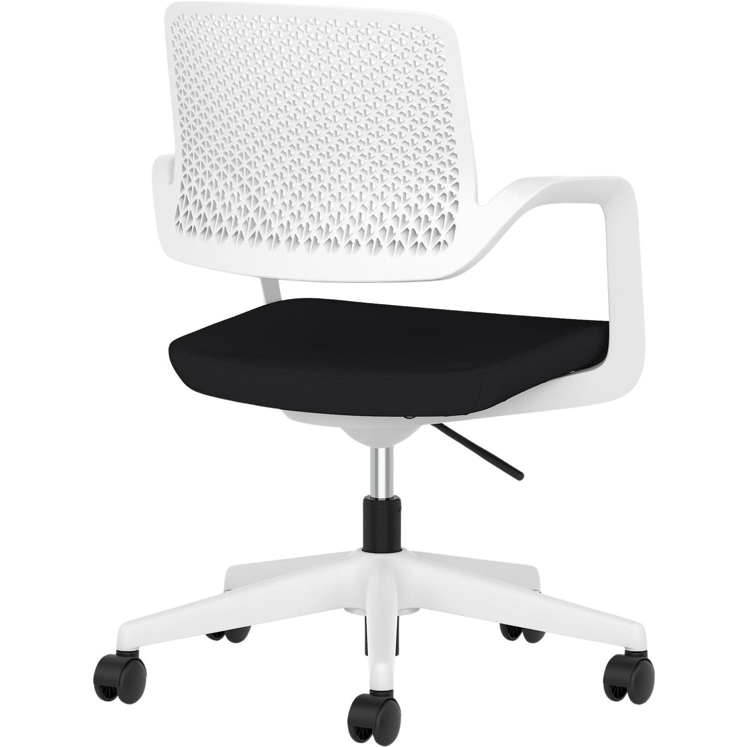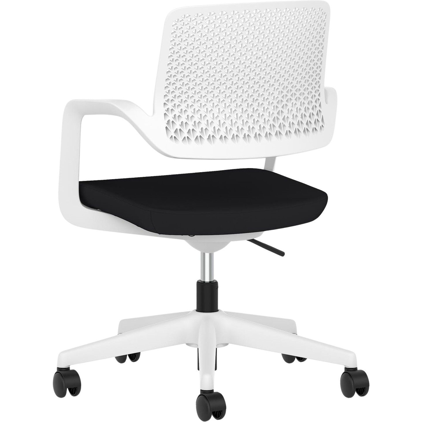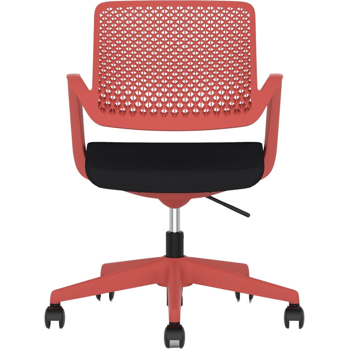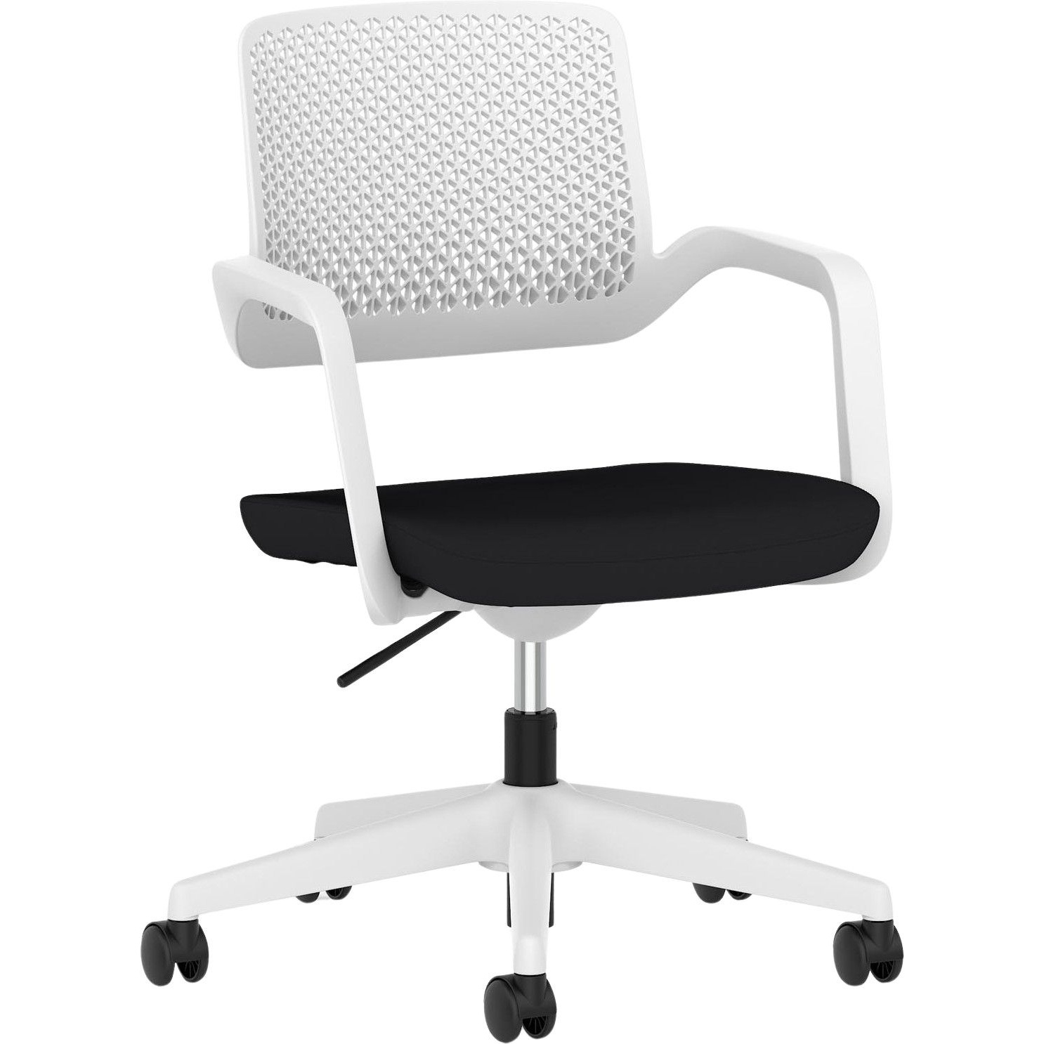 Gas assisted seat height adjusts the chair so the feet are planted firmly on the ground. Thighs should be angled slightly downward for optimum support.