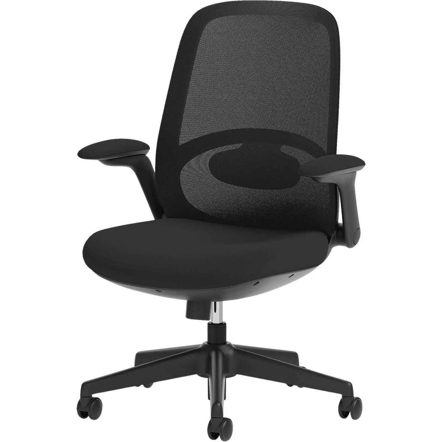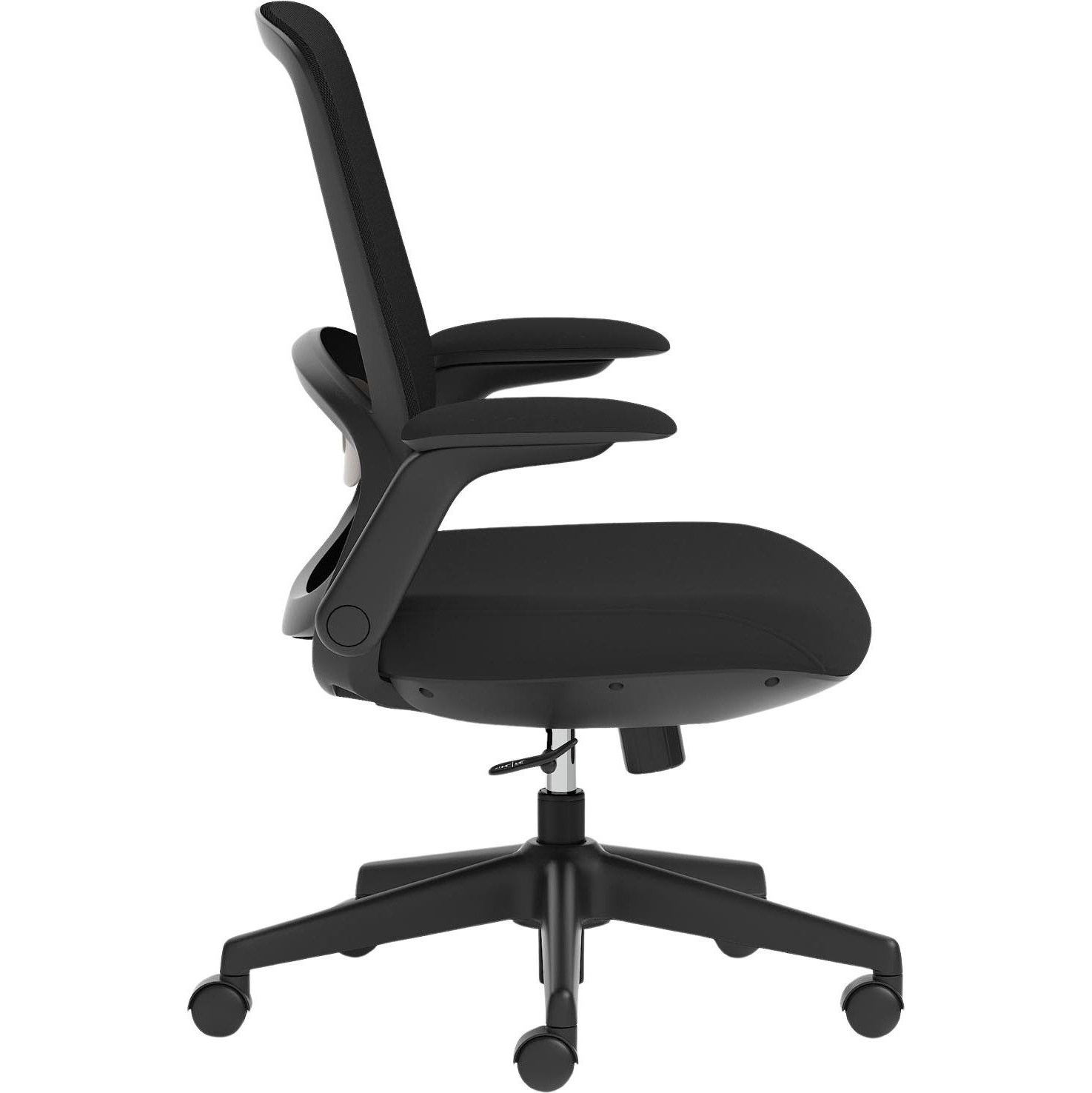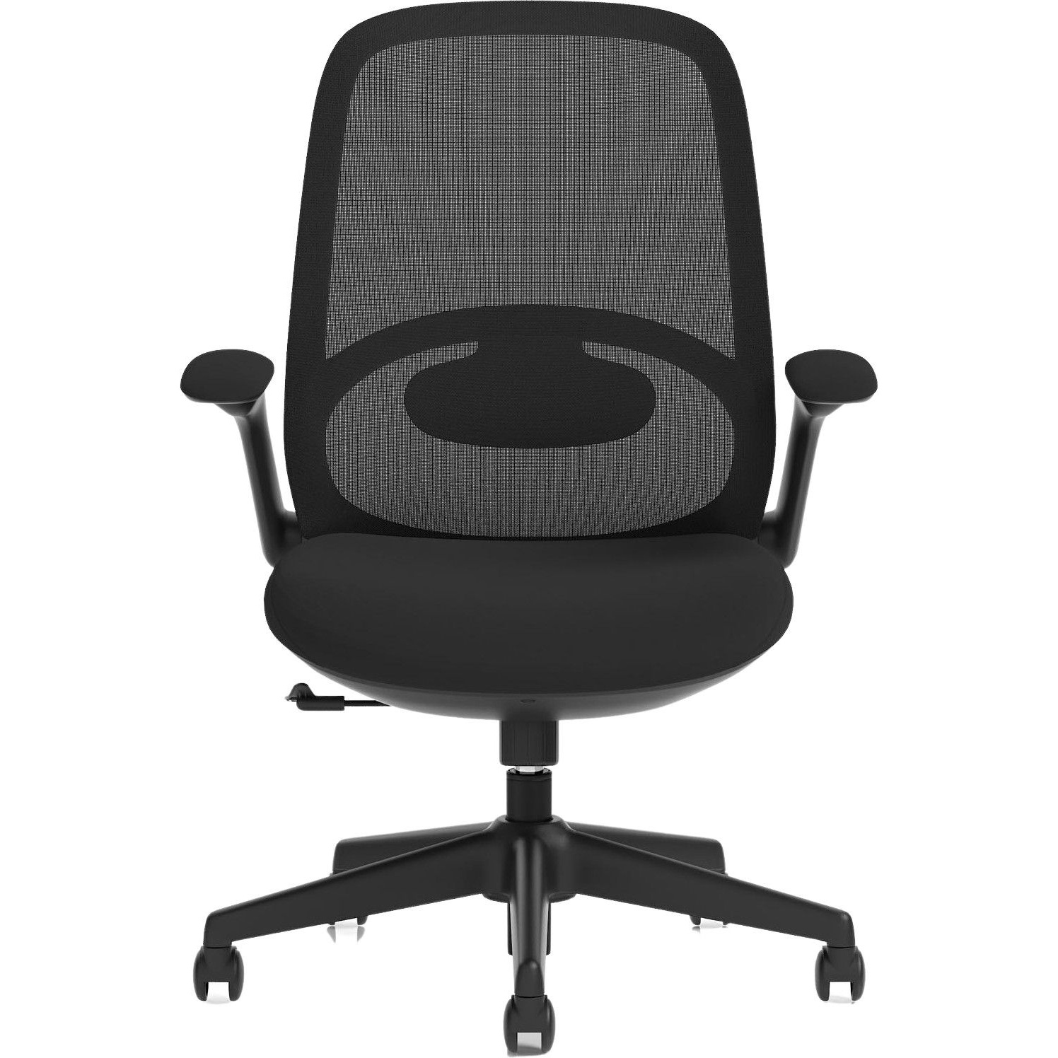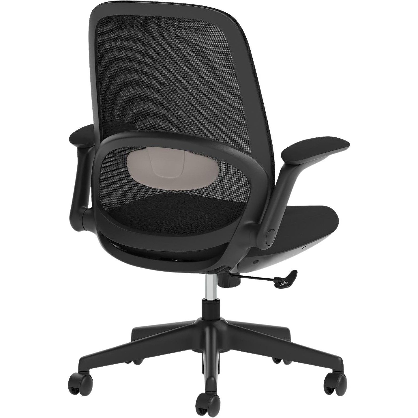 Gas assisted seat height adjusts the chair so the feet are planted firmly on the ground. Thighs should be angled slightly downward for optimum support.