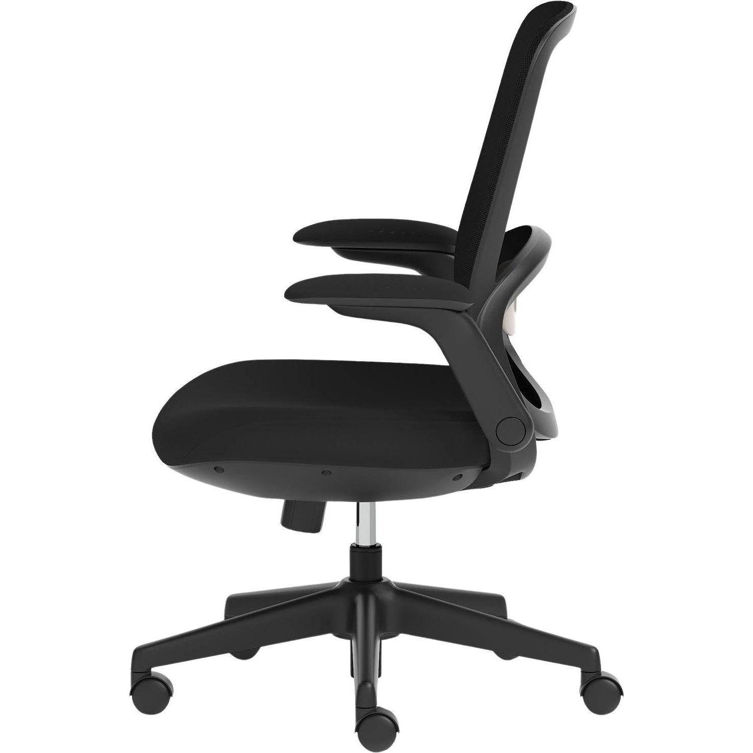 Arms fold down to allow closer access to the desk. Reduces the load on the neck, back, shoulder muscles.