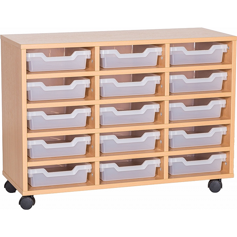 Versatile triple column mobile storage unit complete with 15 shallow Cubby trays.
