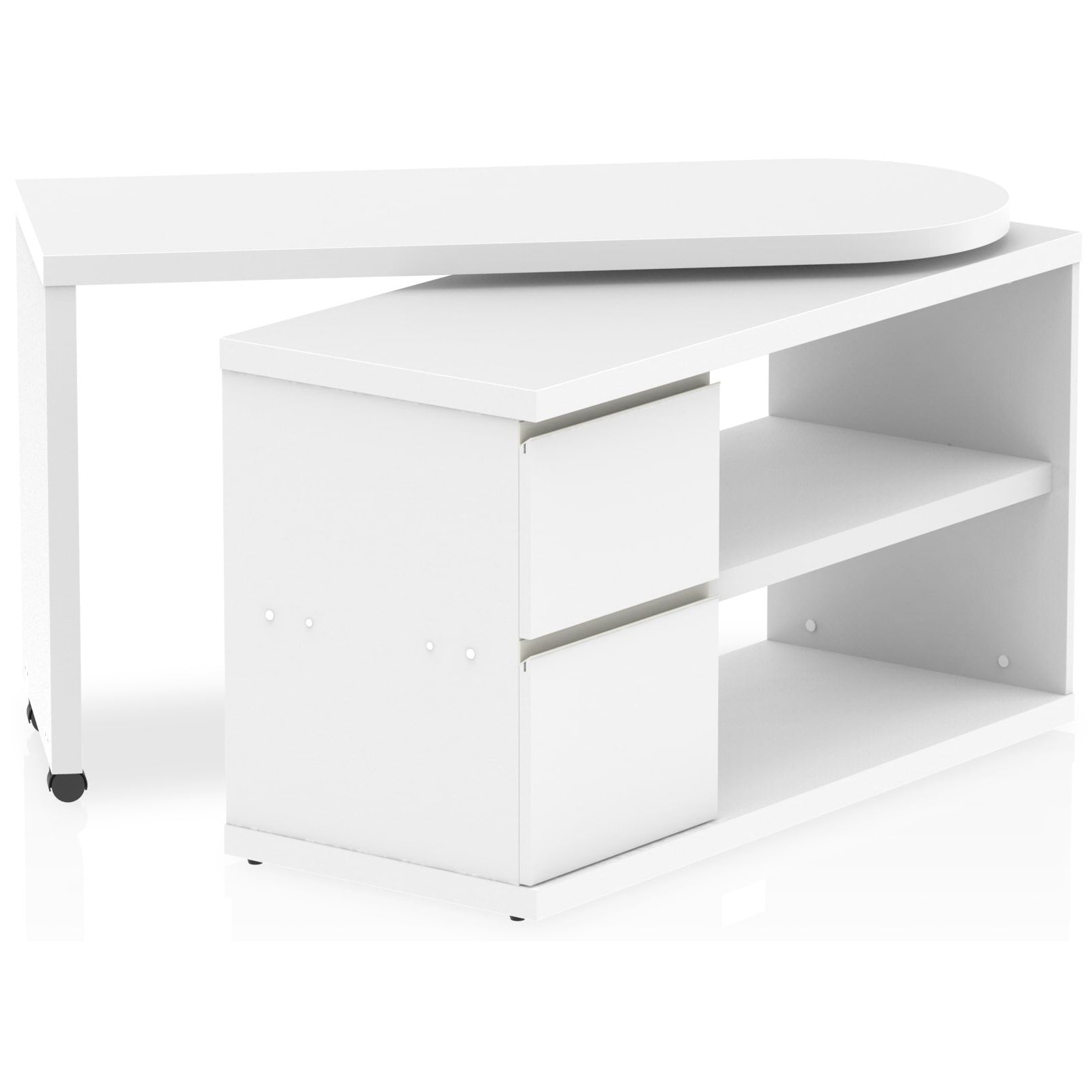 Versatile by design and versatile in nature, the Fleur Smart Storage Home Office Desk is the perfect solution for those in need of an adaptable workspace. The all-encompassing Fleur Smart Storage Home Office Desk includes two fixed shelves, two deep drawers and a dual desktop workspace. A generous desktop work surface rotates 360 degrees and opens the unit into a dual worktop space: L shaped, an extended straight desk or any other shape in between. When not in use, the rotating desktop pivots into a closed position over the storage units – perfect for use in tighter spaces or for those simply wanting a neat, stowaway design. The Fleur is available in a contemporary Grey Oak or Bright White wood colour finish.