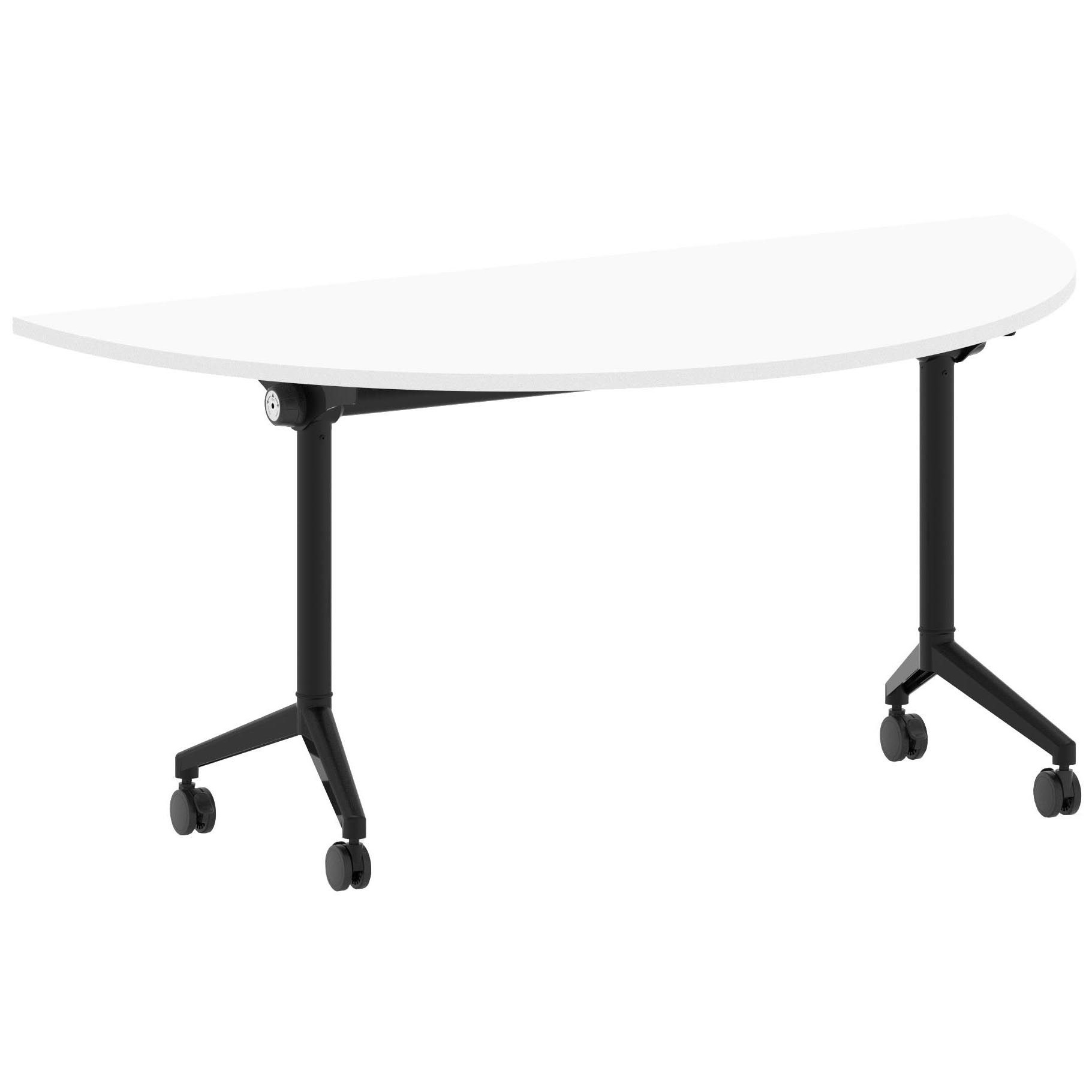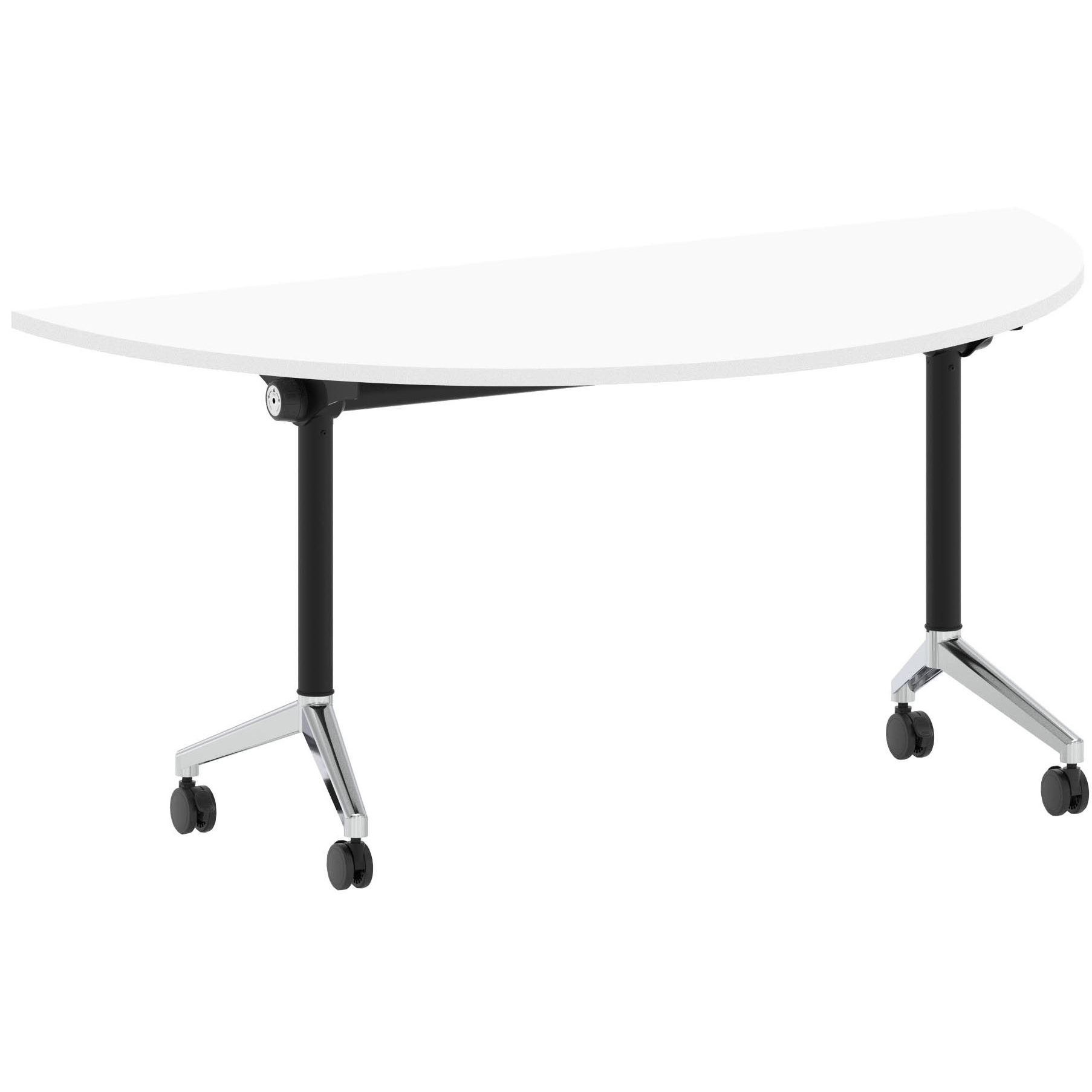 Flex tables go great with both the Air, Impulse, Syndicat, Focus, Contra and Evolve desk ranges or can be used on their own. These flip-top leg office tables are suitable for commercial use and look the part in your meeting room or breakout area. Semi circular tabletop is supported by a sturdy black or silver base with castors and the table is available in a selection of appealing colours. Flex meeting tables are a perfect match with our Flex storage so you can create an appealing, coordinated space.