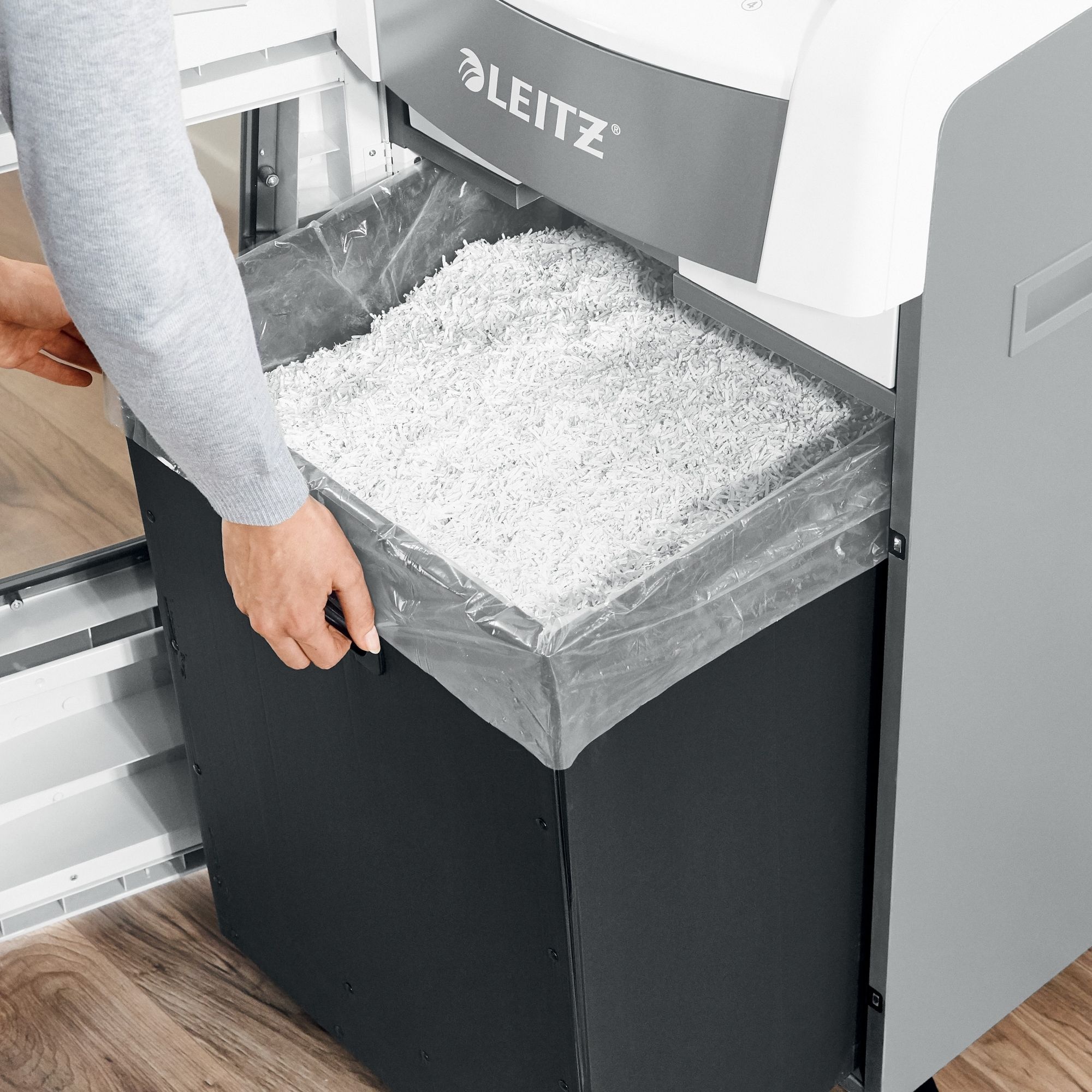 Tailored to fit Leitz IQ shredder bins for easy, secure placement.