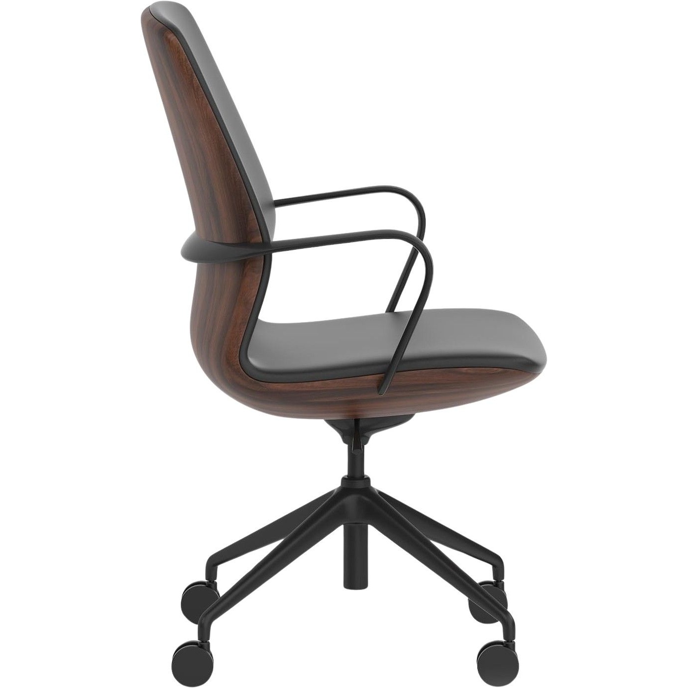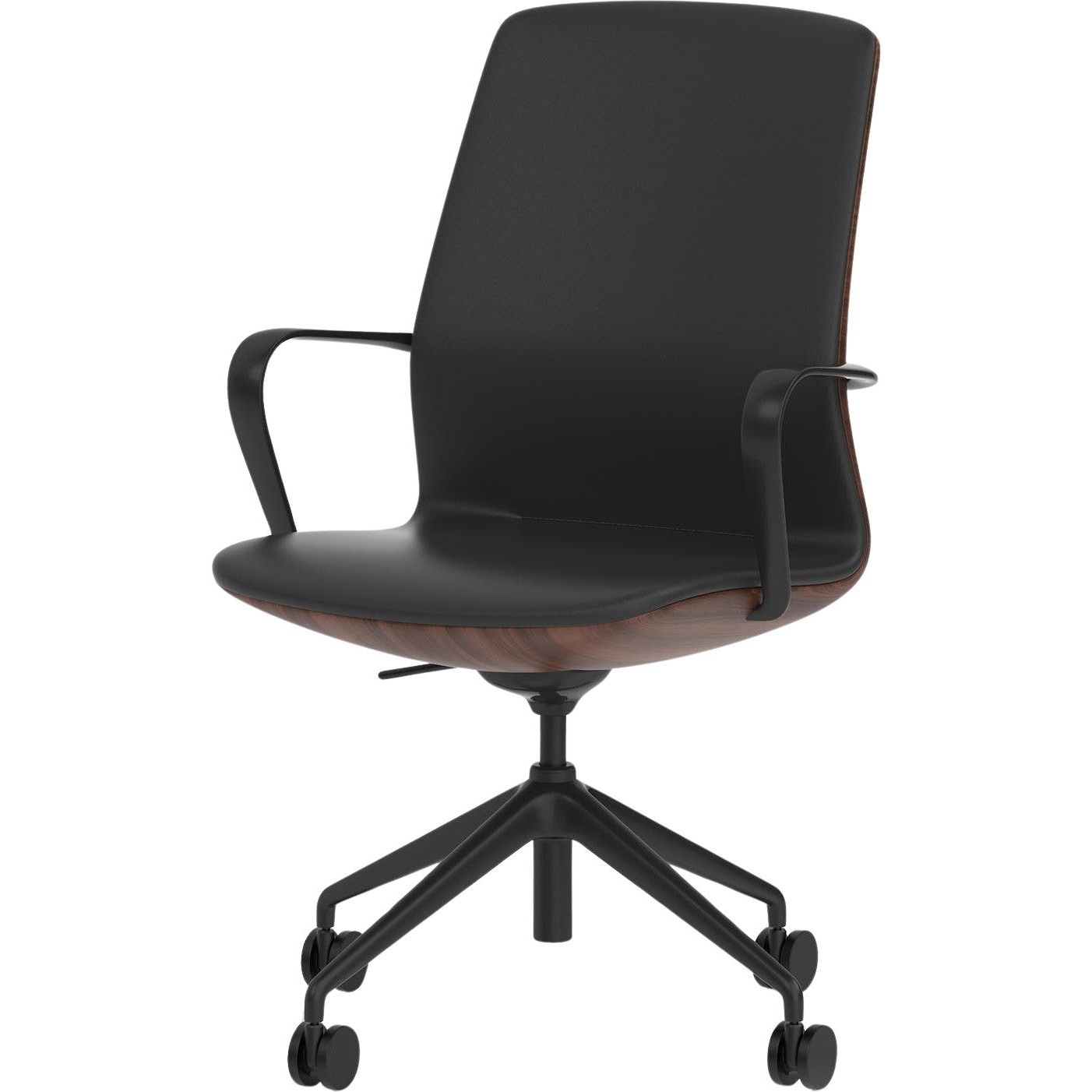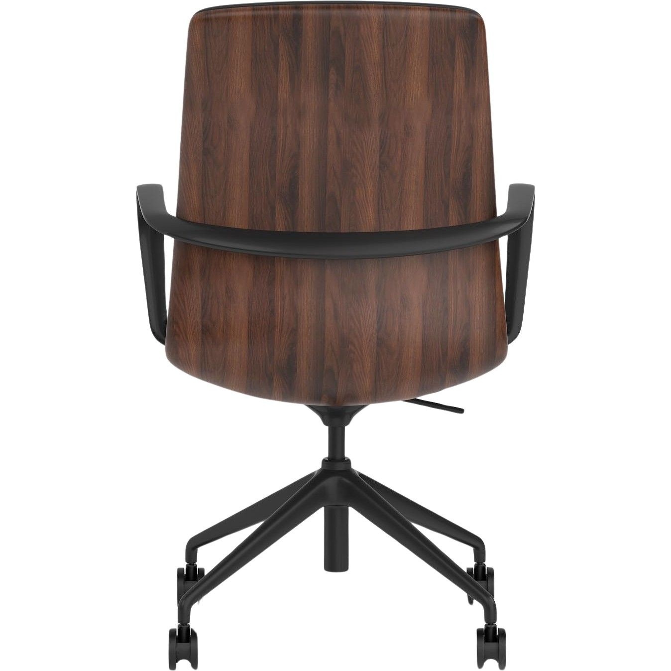 The Mara chair delivers effortless control in a refined, modern silhouette. Its deep, black leather look seat contrasts beautifully with the warm, executive character of the walnut shell, all grounded by a sleek black frame. Crafted to bring understated sophistication to any workspace, Mara combines contemporary style with a confidently elevated presence.