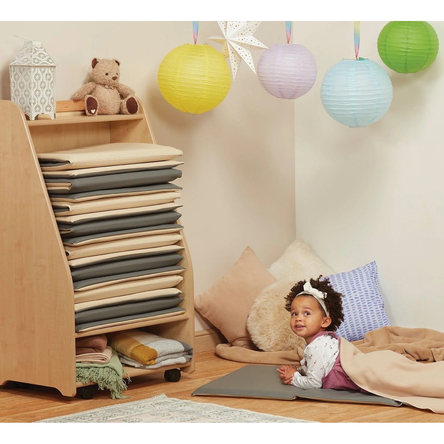 The Naptime Mobile Sleep Mat Store Bundle Deal provides a practical, space efficient solution for organising and transporting sleep mats in early years settings. The unit features a durable maple melamine frame with smooth, rounded edges and is fitted with castors for easy movement between rooms. Supplied with a full set of sleep mats, this bundle helps practitioners set up and tidy away rest areas quickly and efficiently.