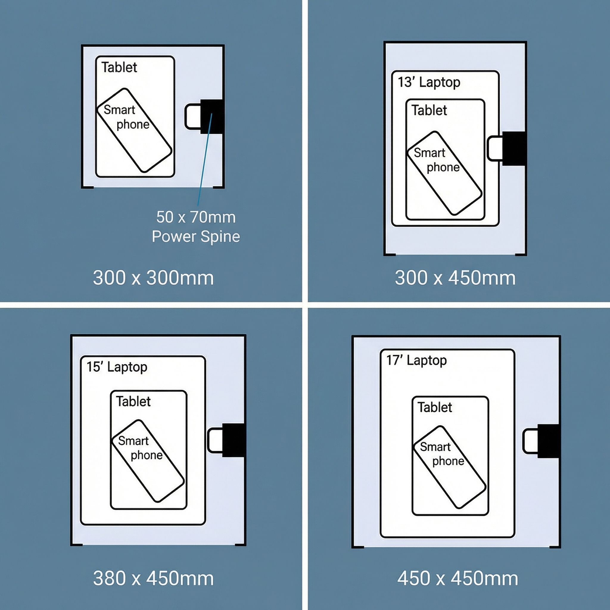 Choose from a variety of internal power configurations to suit your needs: 1x UK Socket, 1x USB-A + 1x USB-C, or 1x UK Socket + 1x USB-A + 1x USB-C.