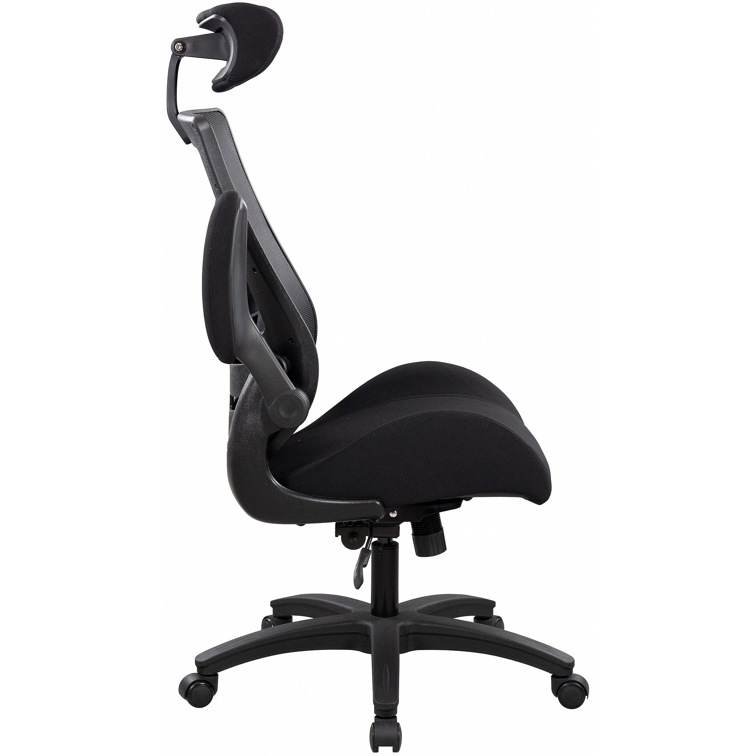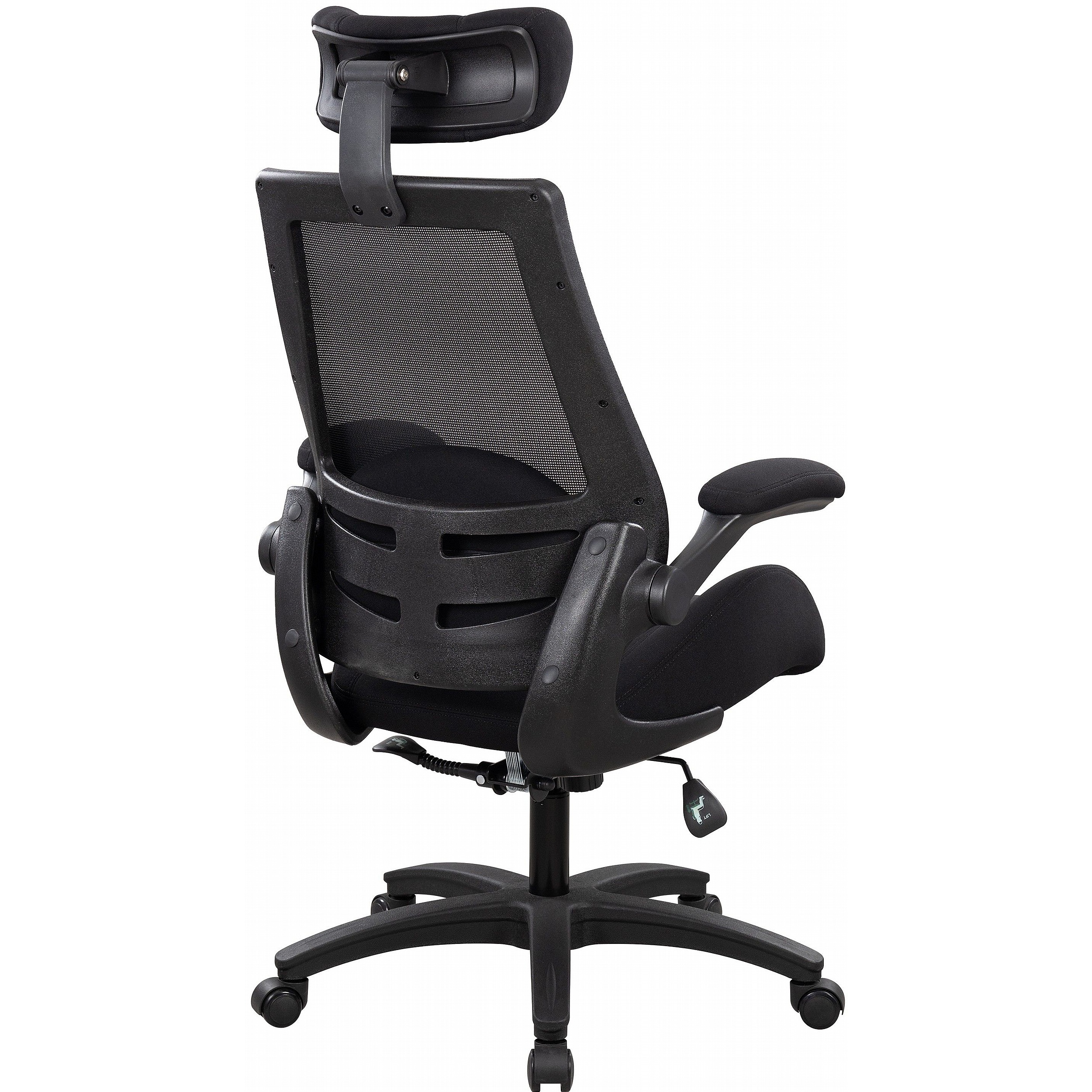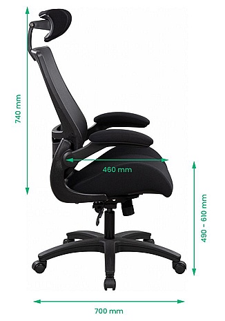 Arms fold down to allow closer access to the desk. Reduces the load on the neck, back, shoulder muscles.